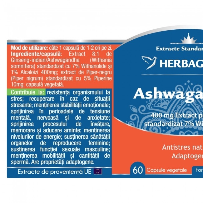 | extract 5-8:1 din părți aeriene și rădăcini de Ashwagandha / Ginseng-indian (Withania somnifera), standardizat cu 7% withanolide și 1 % alcaloizi | 400 mg |