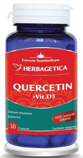 Quercetin cu Vitamina D3 este un produs 100% natural cu efect intens antioxidant, care asigură beneficii importante pentru sistemul imunitar și controlul anumitor tipuri de alergii. În compoziția produsului există 2 extracte importante: extractul de flori de Sophora japonica, standardizat cu 95% Quercetina - 400 mg/capsulă și 300 UI Vitamina D3 (colecalciferol) din lanolină, sursă naturală superioară.
