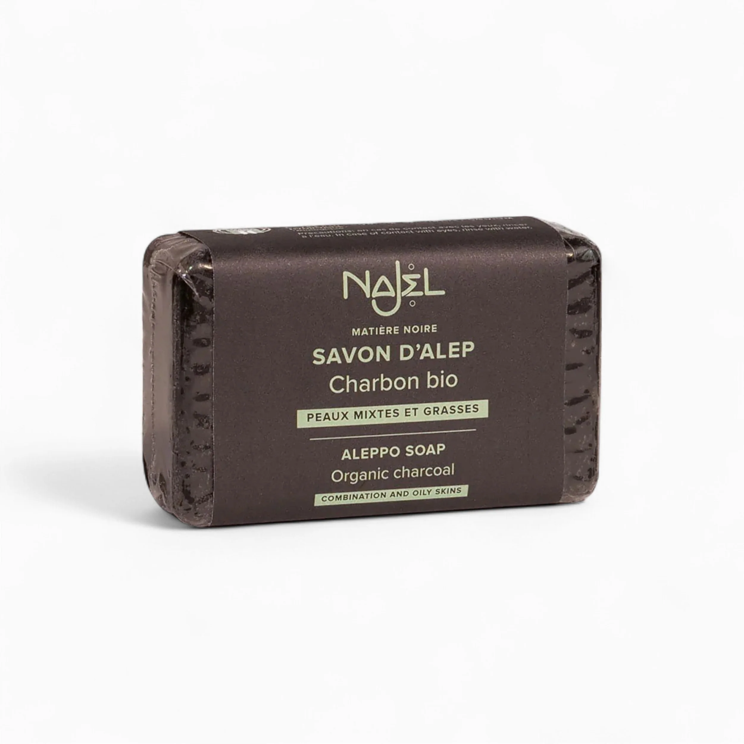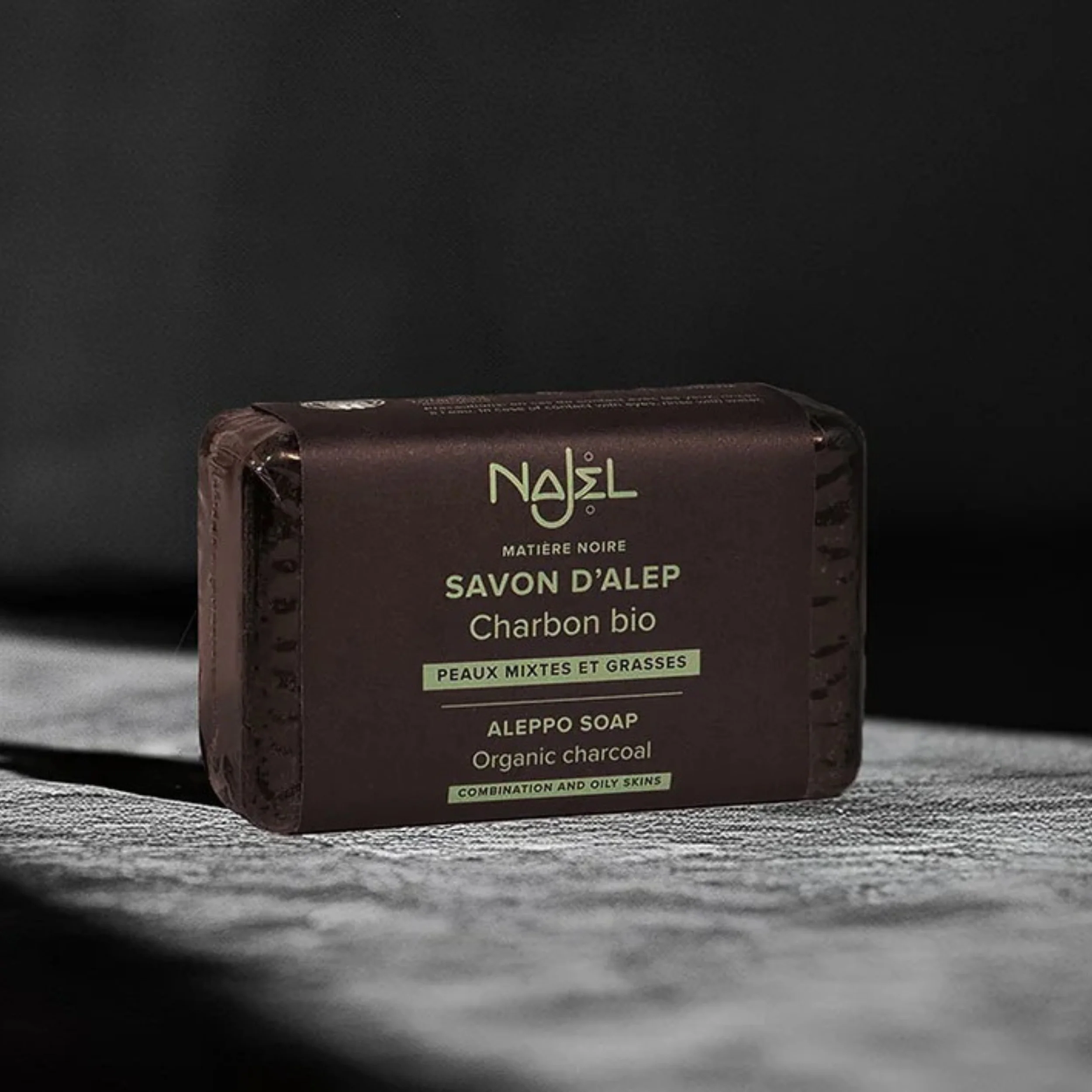 Acest săpun combină tehnicile ancestral siriene ale fabricării săpunului de Alep cu virtutile cărbunelui vegetal, obtinut din Amla, fructul arborelui indian. Cărbunele are calități ridicate de adsorbție: cu cât pulberea este mai fină, cu atât calitățile sale de adsorbție sunt mai bune. Acționează ca un magnet, păstrând toate impuritățile pielii (poluanți, toxine, exces de sebum). Compus din ulei de măsline și ulei de dafin, săpunul Najel cu cărbune vegetal organic vă va curăța, detoxifica și revitaliza pielea. Este un tratament de purificare care îți va lăsa tenul arătând mai tânăr și mai luminos.